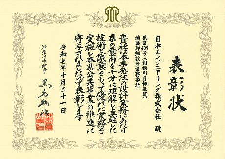 当社は、神奈川県知事殿より「県道409号(相模川自転車道)橋梁詳細設計業務委託」において、県の意向を十分に理解し卓越した技術と誠意をもって優れた業務を実施したことを評価され表彰を受賞しました。2年連続の受賞となります。