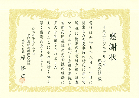 当社は、首都高速道路株式会社東京西局長殿より令和七年八月十一日に発生した火災事故の対応において迅速に橋梁の火災時点検・調査マニュアルに基づく点検を実施し首都高速道路の安全性の確保に貢献したことを評価され、感謝状をいただきました。