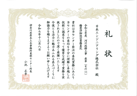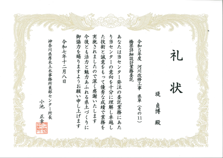当社は、神奈川県厚木土木事務所東部センター所長殿より「令和5年度 河川改修工事 県単(その11)橋梁詳細設計業務委託」の遂行にあたりセンターの意向を十分に理解し卓越した技術と誠意をもって優秀な成績で業務を実施したことを評価され礼状をいただきました。