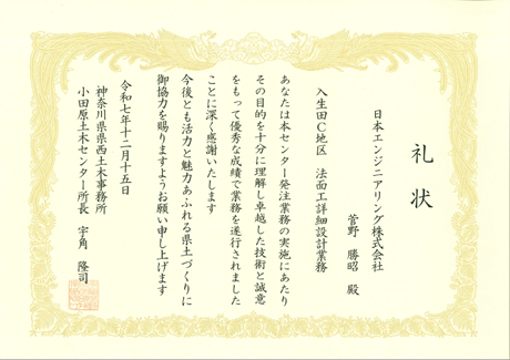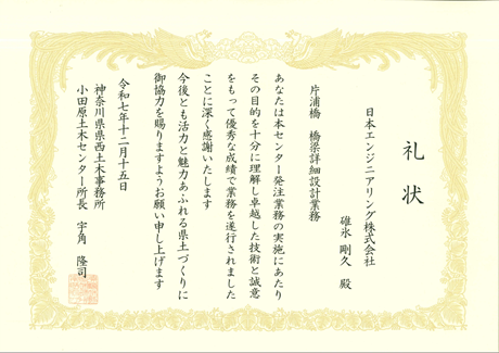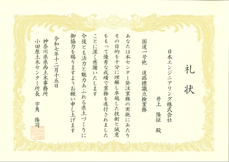 当社の各担当者は、2025年12月15日付で神奈川県県西土木事務所小田原土木センター所長殿より「国道一号他 道路標識点検業務」「国道一三五号 越波対策予備設計業務」「入生田C地区 法面工詳細設計業務」「片浦橋 橋梁詳細設計業務」の各業務において、その目的を十分に理解し卓越した技術と誠意をもって優秀な成績で業務を実施したことを評価され礼状をいただきました。
